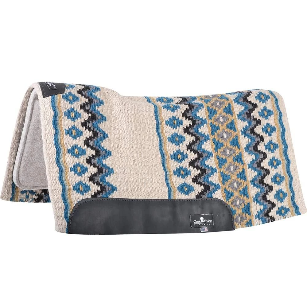 Contoured 100% wool blanket top can be folded back for shim placement if necessary and lays clean and flat against the pad. Contoured felt body with a shaped design to mimic the horse’s topline. XPF center with a self adjusting profile that provides the highest level of protection. Orthopedic grade felt bottom soaks up moisture, allowing heat to dissipate away from the horse’s back. Conforms to the horse’s back while maintaining density. One-pad system perfect for all disciplines.