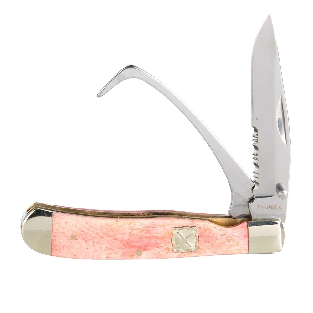 This Twisted X Farriers Companion Knife is made with stainless steel blades and has a pink bone handle.